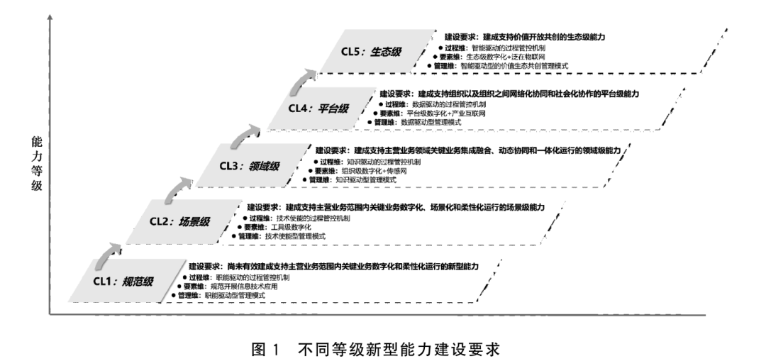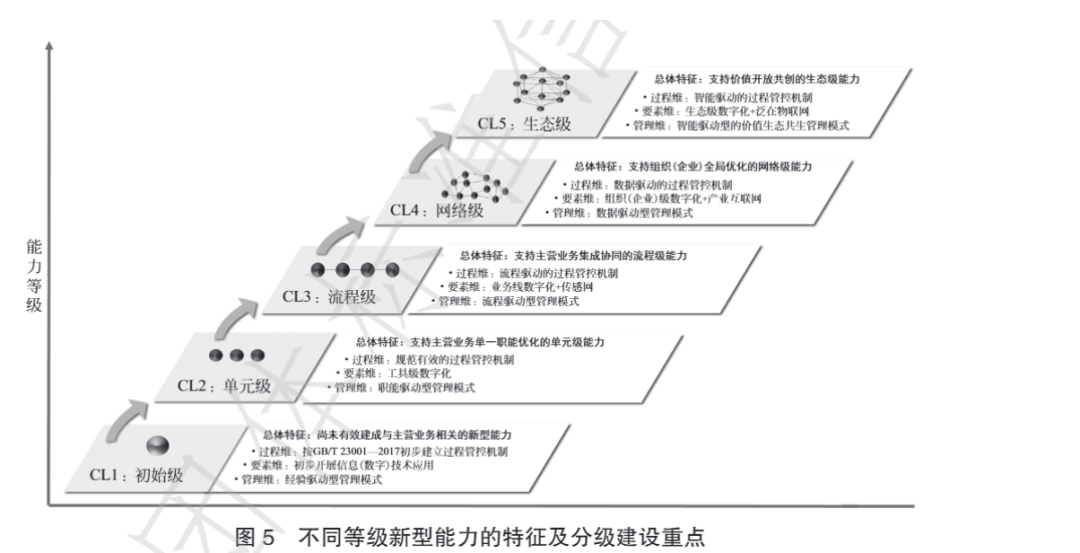 新型能力的建设是一个循序渐进、持续迭代的过程,团体标准将新型能力的等级由低到高划分为CL1(初始级)、CL2(单元级)、CL3(流程级)、CL4(网络级)和CL5(生态级)五个等级,不同等级能力呈现不同的状态特征以及能力单元/能力模块的过程维、要素维、管理维的不同建设重点。