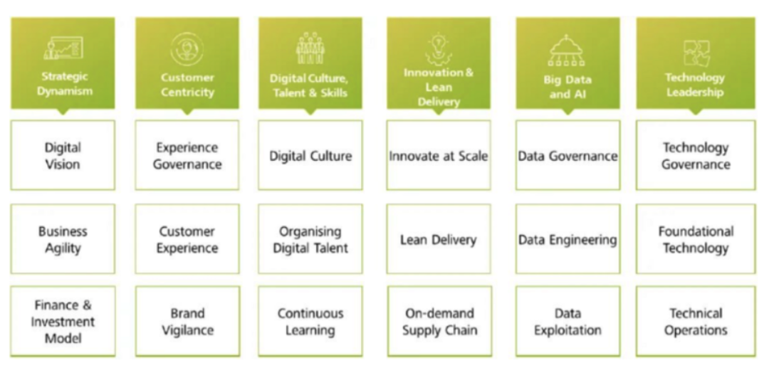 ODMM全称为Open Digital Maturity Model,是衡量企业数字化能力成熟度的一个整体模型。ODMM将企业数字化能力划分为:战略动力,以客户为中心,数字文化、人才和技能,创新与精益交付,大数据与人工智能,以及技术领先等6大评估维度,每个评估维度都包含3个子维度,一共18个子维度,如上图。