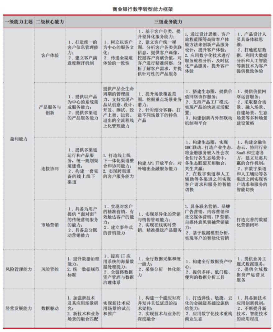 探索入门阶段:商业银行已经了解了数字化转型的实现路径和成效,开始储备数字化人才,积极开展组织架构转型,探索新技术研究和数字化场景实践。