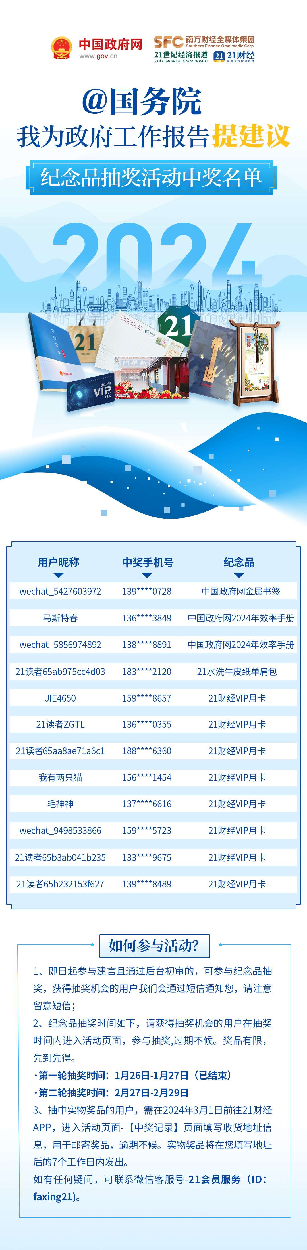 今日,第一轮(1月26日—1月27日)抽奖结果正式公布,恭喜以下网友获赠中国政府网2024年效率手册、21财经VIP月卡等纪念品!