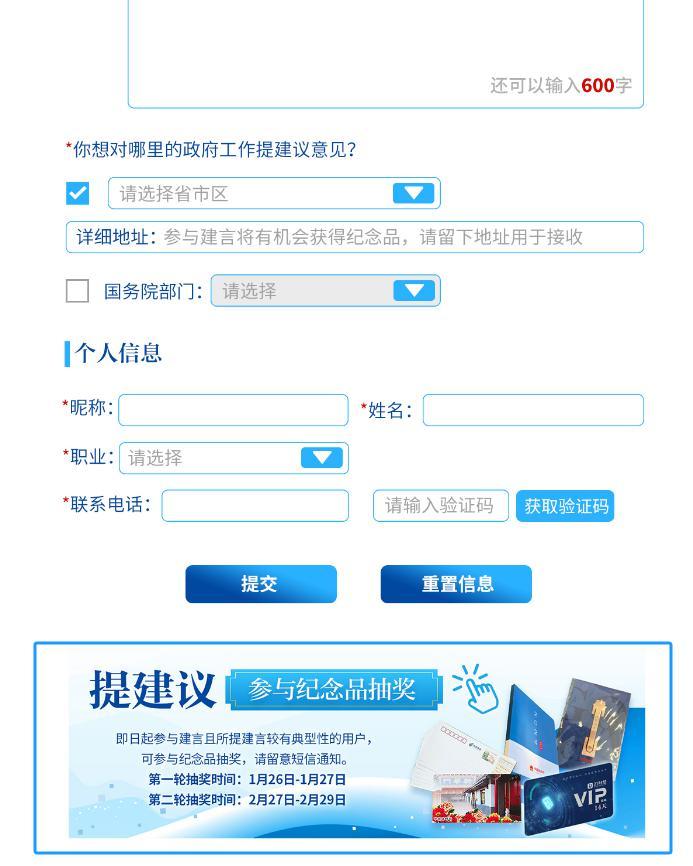 进入建言活动页面,填写并提交建言。收到抽奖资格确认的短信通知后,在抽奖活动期间,再次进入建言活动页面,点击“提交”按钮下方的活动入口图片即可参与抽奖(如下图)。