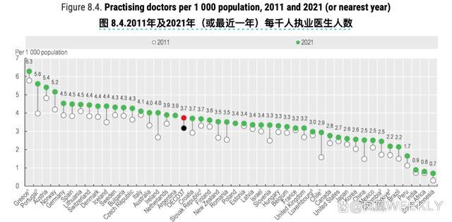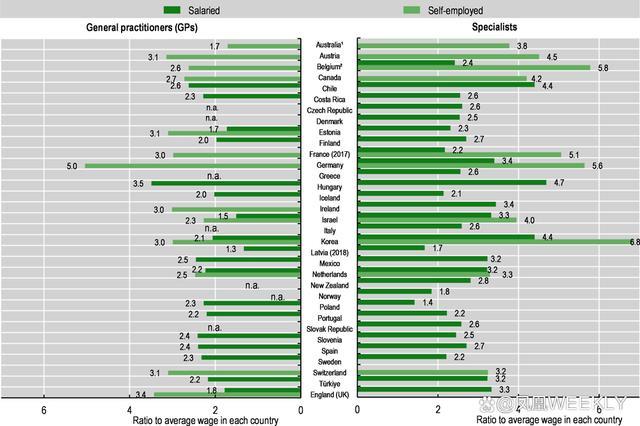 OECD各成员国医生收入与该国国民平均收入的差距。