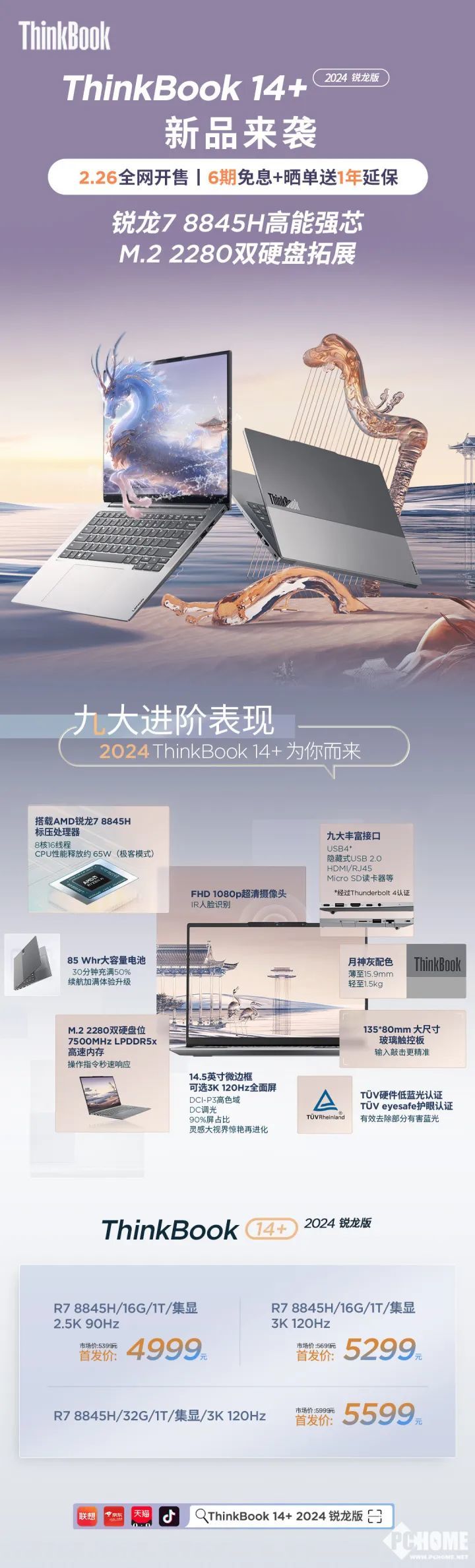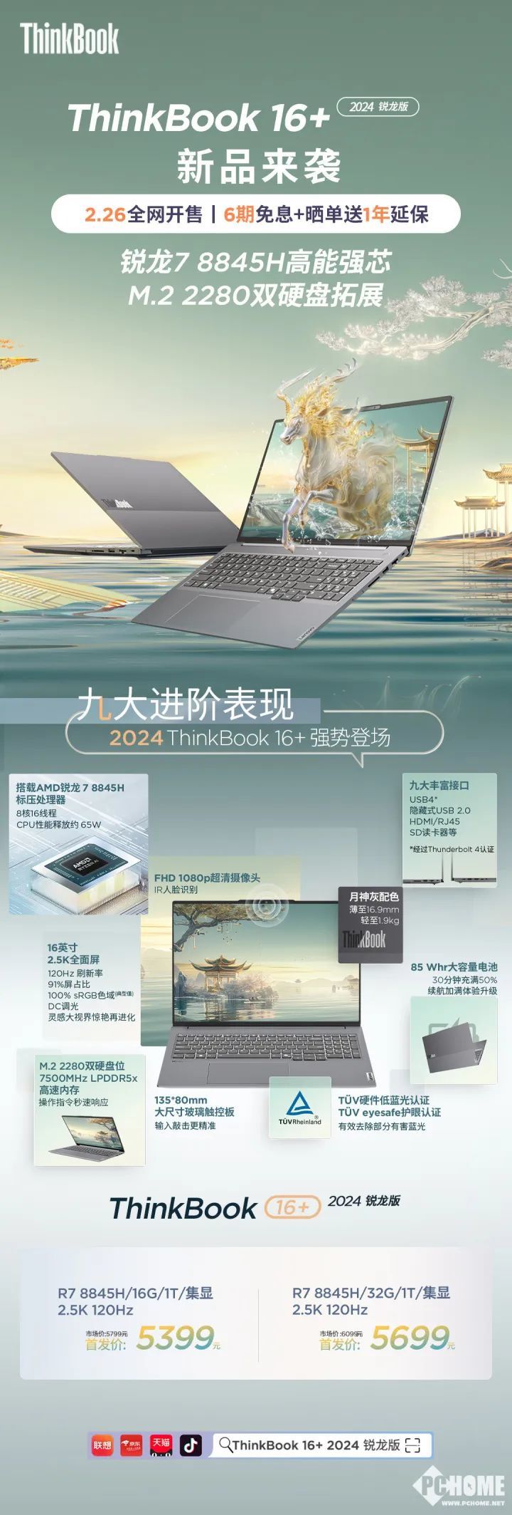联想现已发布了全新的ThinkBook 14+/16+ 2024锐龙版笔记本,全系标配AMD锐龙7 8845H处理器。ThinkBook 14+2024锐龙版首发价4999元起,ThinkBook 16+2024锐龙版首发价5399元,将于2月26日正式开售。