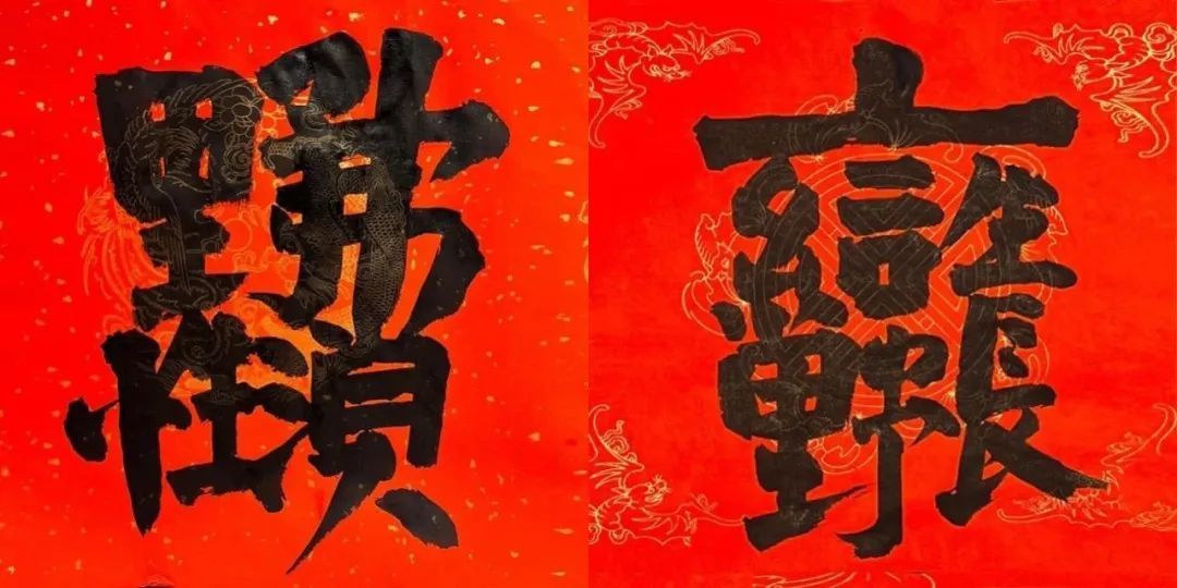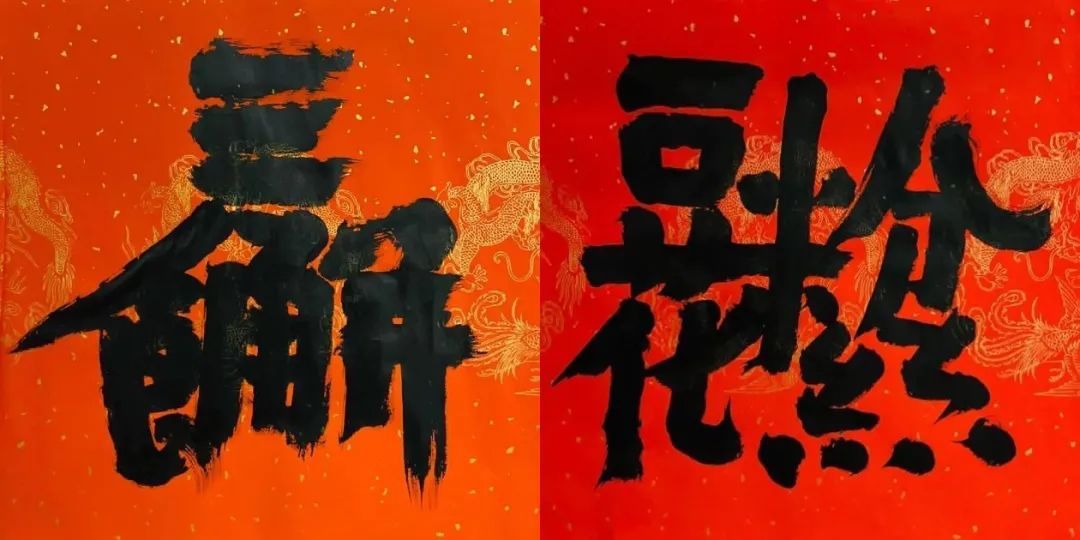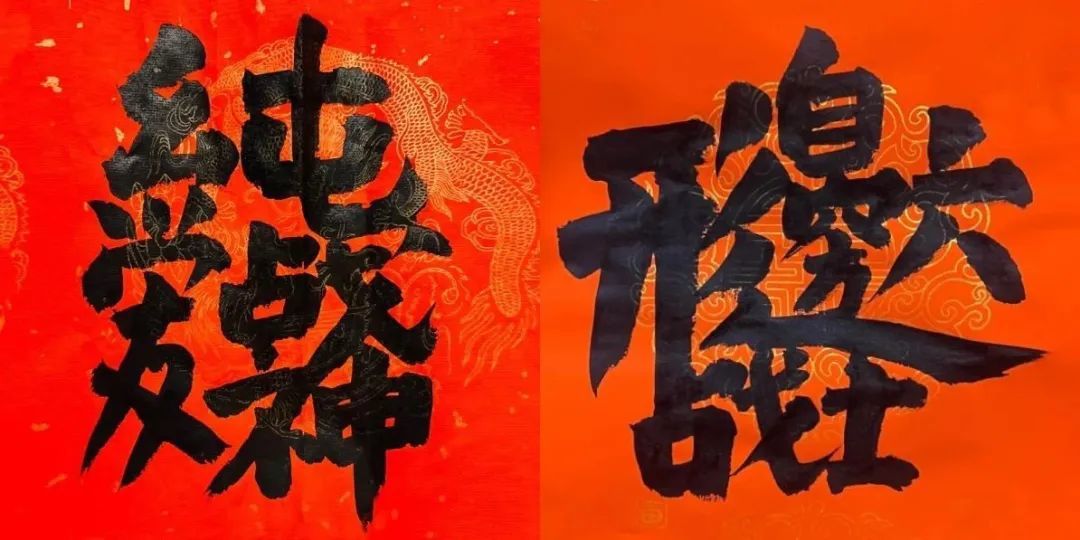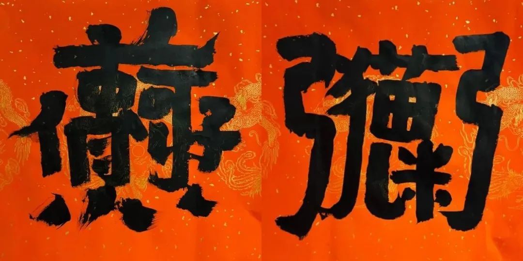 合体字不是简单的把几个字拼成一个大型的字,往往要巧妙地共用偏旁,借用字形拆解、重组,有时候要参考繁简,篆隶楷行草不同字体写法。要做到让人眼前一亮,恍然大悟,拍手称快。合体字的营造构思本身偏于设计,书法家和篆刻家来搞字体设计,自然是降维打击。而不同的书法家临摹不同的碑帖,对汉字的理解不同,同一个词组设计出来的合体字会很不一样。书法家的书写风格,用笔粗细习惯,也会反过来影响到字体设计。
