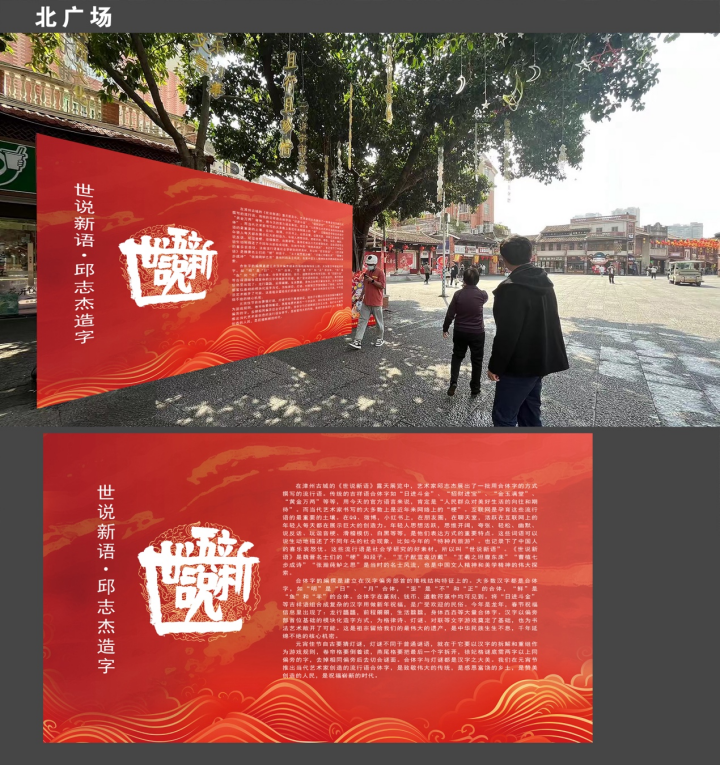 在漳州古城的《世说新语》露天展览中,中央美术学院副院长、艺术家邱志杰展出了一批用合体字的方式撰写的流行语。