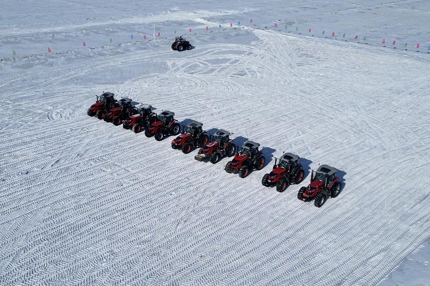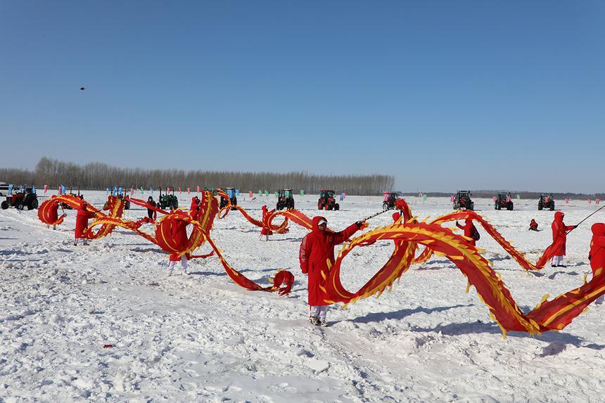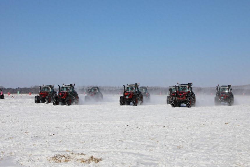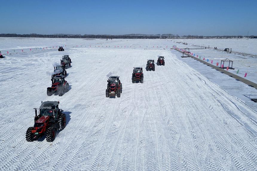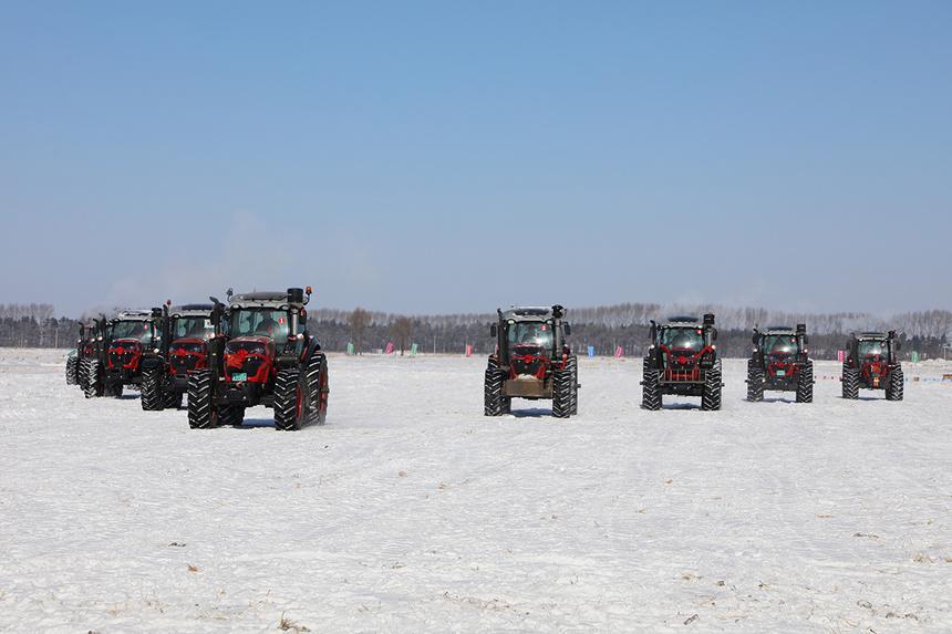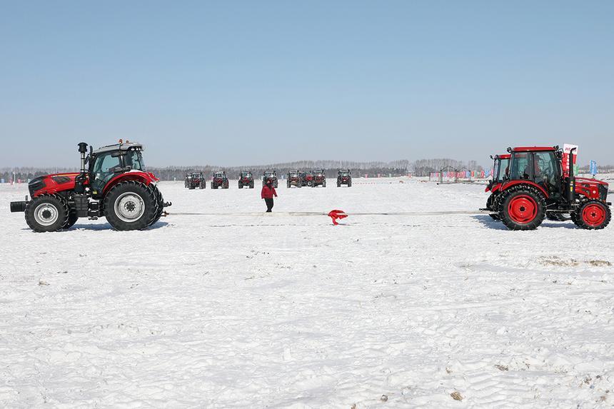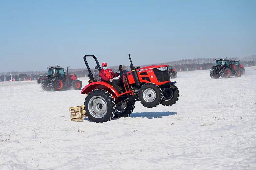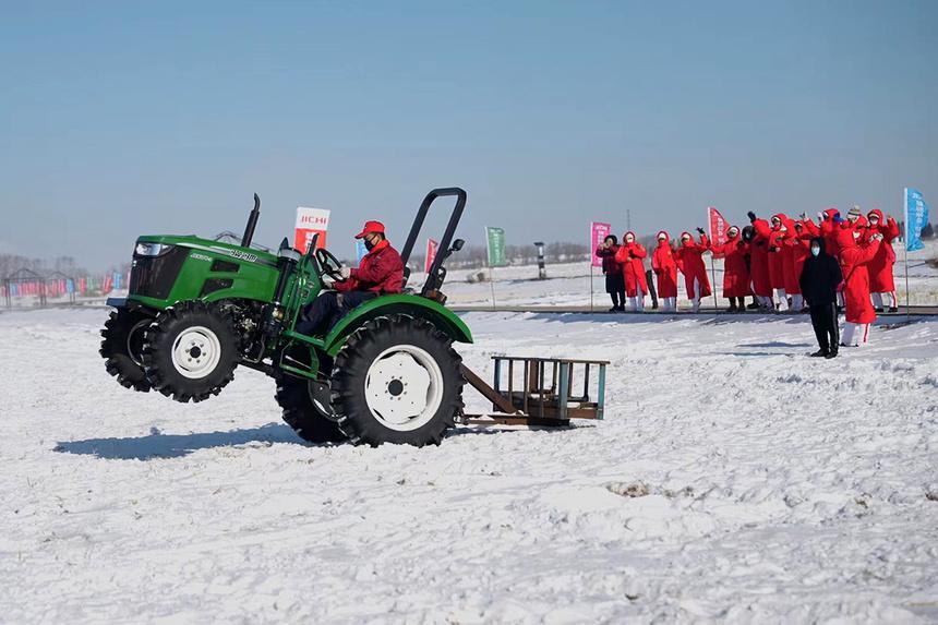 白雪皑皑的稻田地上,9台大马力拖拉机在专业驾驶员的操作下通过不同形状编队走着秀;一旁的小马力拖拉机后仰30度旋转、摇摆,演绎着优美的雪地芭蕾;拖拉机拔河气势磅礴,引擎的轰鸣展示着机器的超强动力储备能力……其中,最吸引人的还是当属拖拉机竞速比赛。