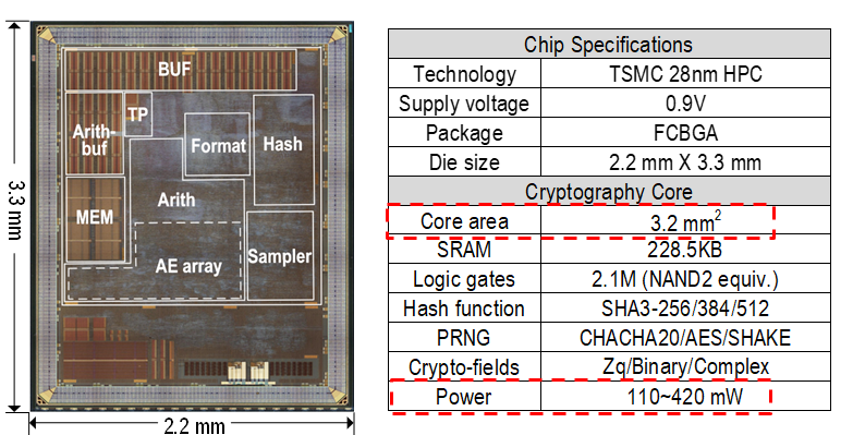 ★ Dilithium-II数字签名算法:吞吐性能可达15.8k次/秒运算,一次完整的运算能量消耗为26.6uJ;