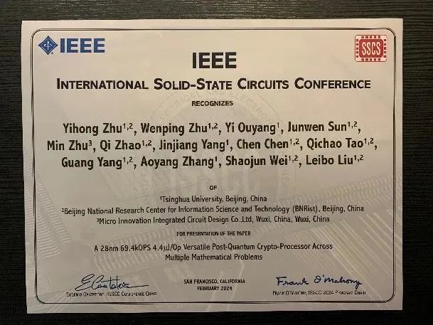 近日,国际固态电路会议(ISSCC 2024)在美国加州金山万豪酒店隆重举行。清华大学刘雷波教授团队在会上作了题为 “A 28nm 69.4kOPS 4.4μJ/op Versatile Post-Quantum Crypto-Processor Across Multiple Mathematical Problems”的学术报告,并受邀参加demo分会。本次报告是基于沐创集成电路和清华大学刘雷波教授团队共同撰写的可迁移抗量子密码芯片的成果论文,而该文章也是沐创在ISSCC上发表的第二篇文章。