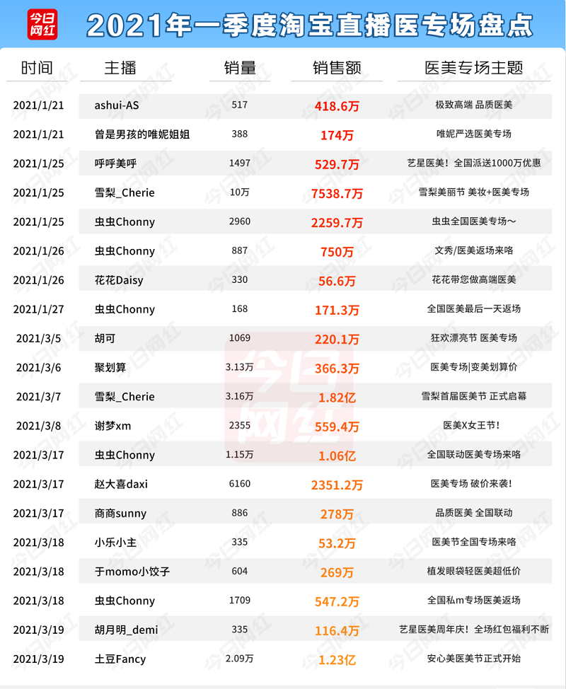 而据不完全统计,雪梨、虫虫、林珊珊、土豆Fancy等头部主播都开过医美专场。其中雪梨曾创下医美专场单场GMV直逼2亿的成绩;@土豆fancy也曾获得3.93亿订单总销售额,黄金微针项目的总引导成交额达932万元,肉毒素保妥适、衡力等瘦脸项目的总引导成交额达913万元。2021年的时候,这两个主播就凭借在医美直播上的优势,多次在“带货红人(淘抖快)TOP20”上超越李佳琦。