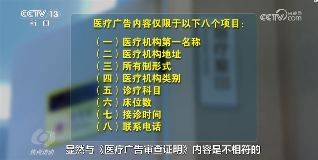另,根据《医疗广告管理办法》规定,医疗广告内容仅限于以下八个项目:(一)医疗机构第一名称;(二)医疗机构地址;(三)所有制形式;(四)医疗机构类别;(五)诊疗科目;(六)床位数;(七)接诊时间;(八)联系电话。