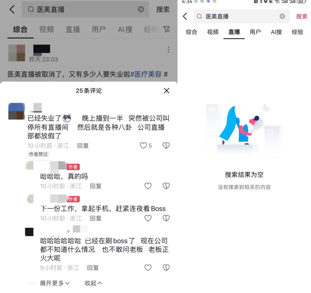 节目播出后不久,多个平台的医美直播间就被强制叫停,有相关工作人员表示“晚上播到一半被叫停,目前公司直播部都放假了”。此外多个知名抖音医美达人皆被封号,抖音目前已搜索不到医美的相关直播。
