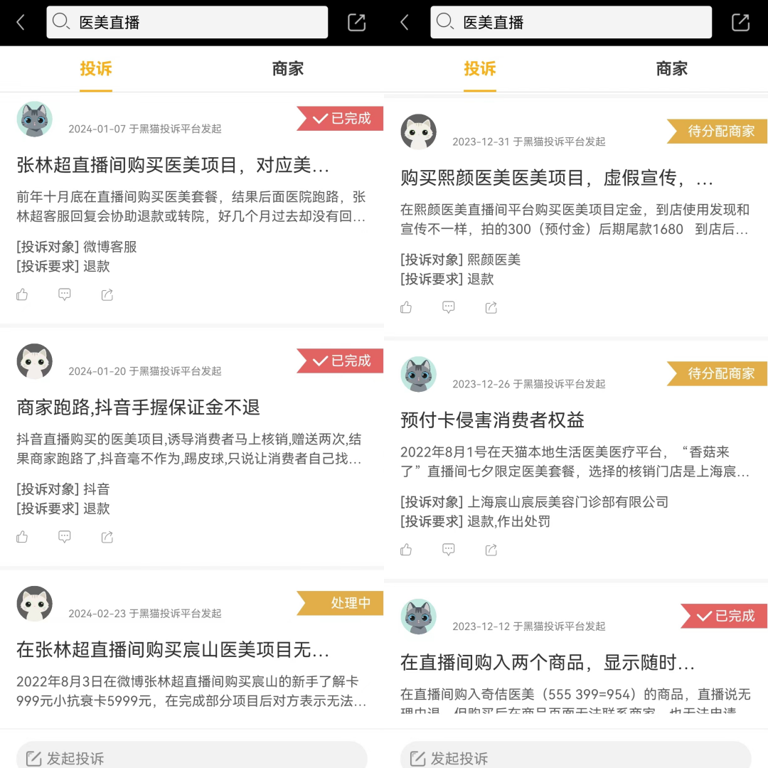 另外,在社交平台、第三方投诉平台上,涉及医美直播的投诉亦众多,内容包括:使用直播间购买的医美项目黄金微针导致烂脸;直播间下单后,线下一直预约不上相关项目;在直播间买的医美项目,未到院使用却被核销……而直播间“破价”“超低价”的噱头,也让这个市场充斥着假货、水货等隐患。