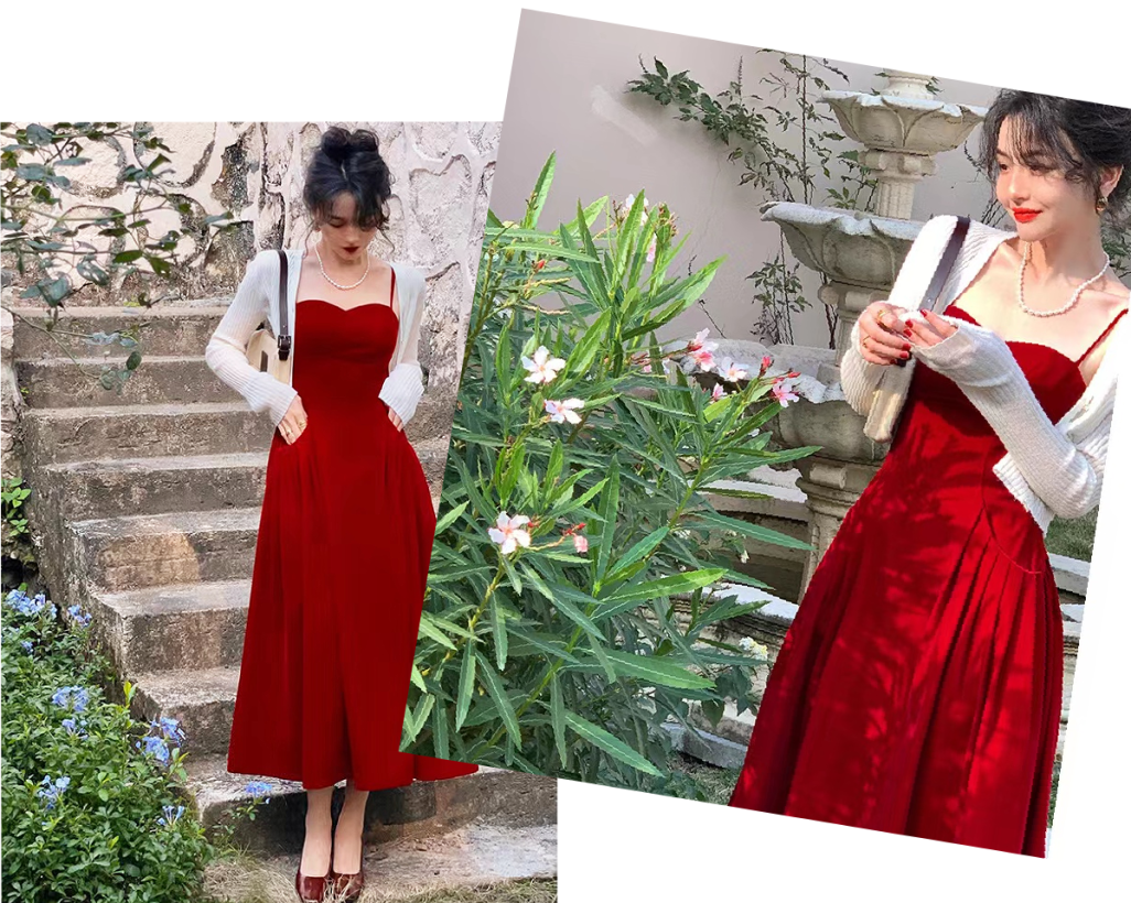 红丝绒吊带穿上真的很抬气色,贼显白。