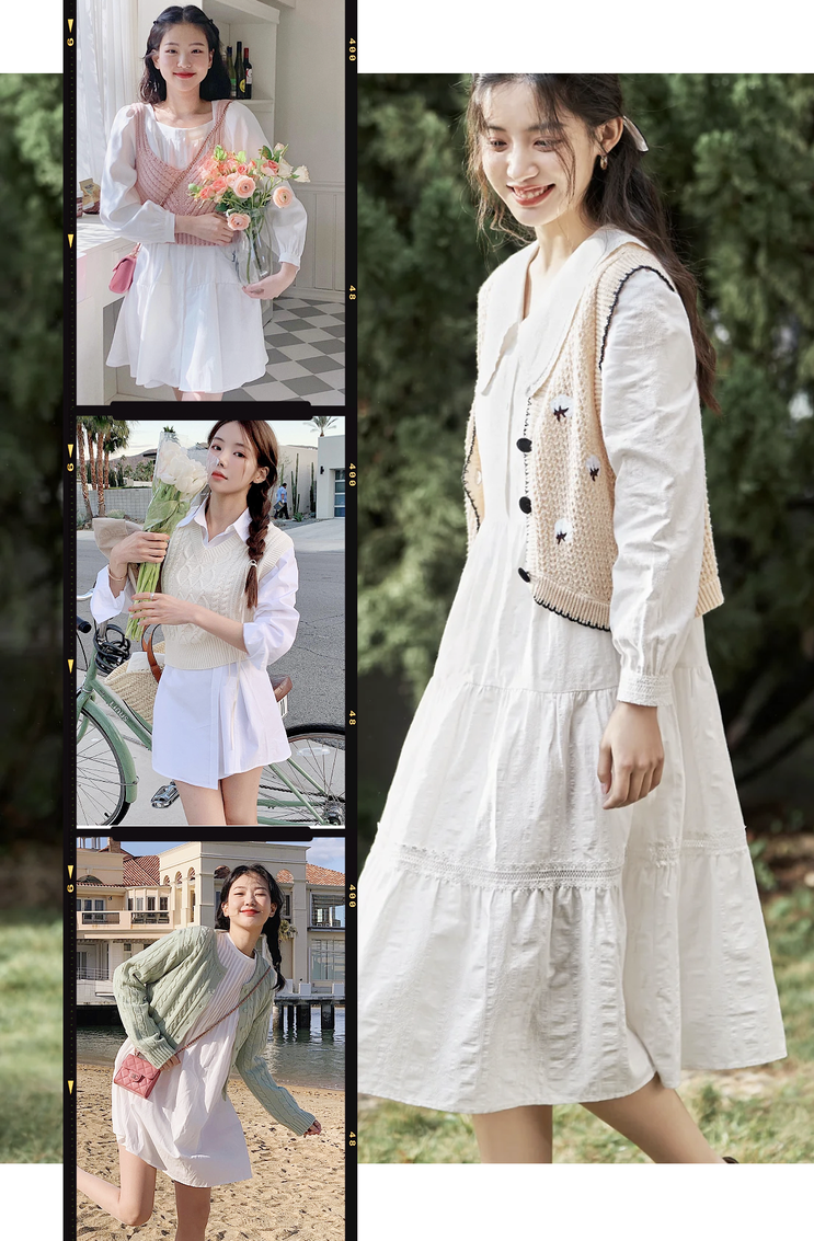 春天的背心裙很适合叠穿,按头安利针织款的,和衬衫、T恤叠加在一起都很好看~