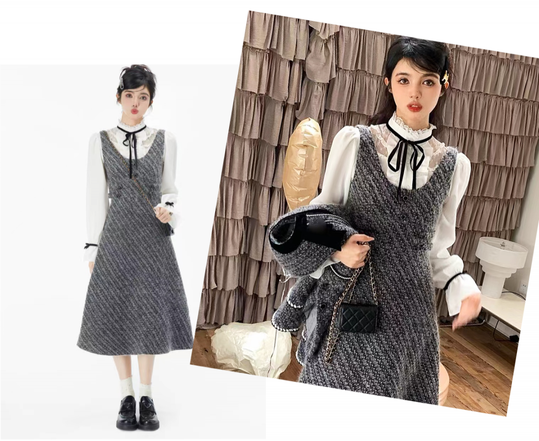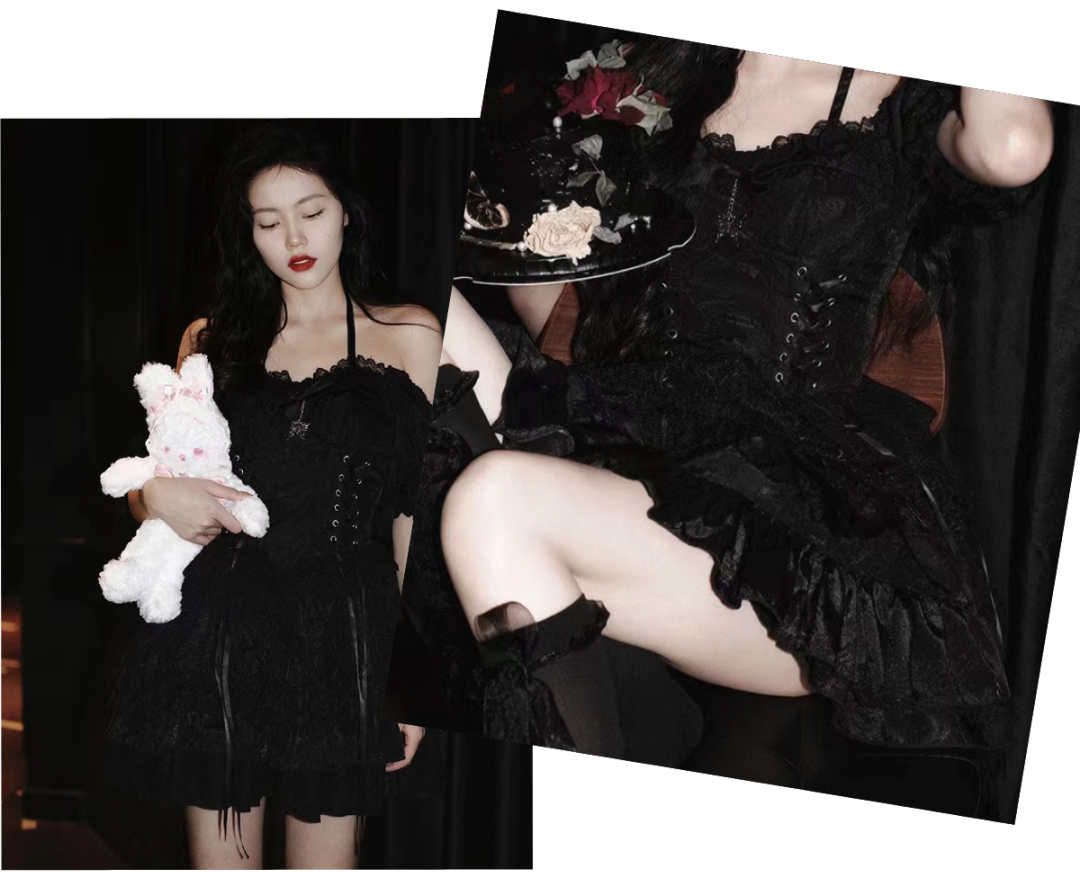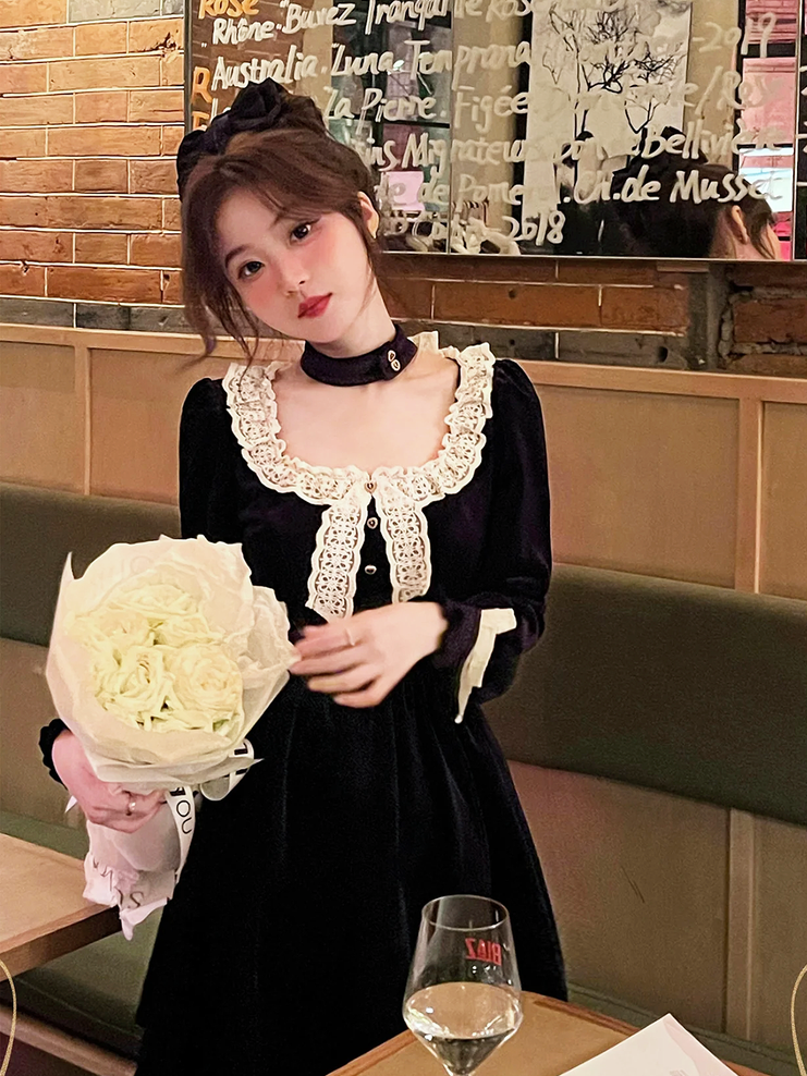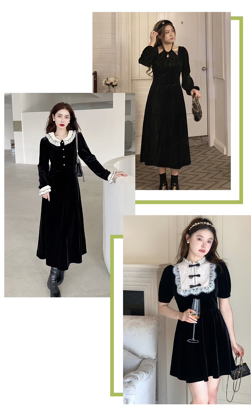 miu味十足的丝绒裙肯定是少不了,白蕾丝&黑丝绒这组cp,穿上身真的就很有千金小公主的感觉。