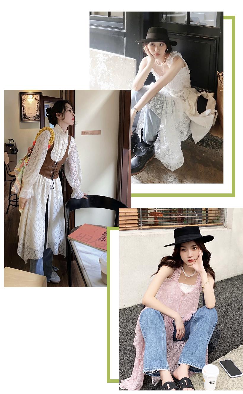 不要穿一整身的蕾丝,可以用西装、针织 or 单宁......去打破视觉的疲惫感,层次感提升之后看起来就会时髦。
