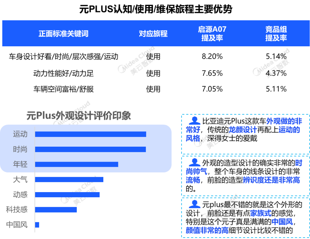 元PLUS集潮跑外观、律动内饰、智能安全、潮趣驾驶、e平台3.0明星平台等优势于一身,多个“使用体验”广获好评,车身设计、动力性、空间感、续航表现出色,尤其是“车身设计和动力”好评度远高竞品。“颜值在线”的同时,运动、时尚及科技感等设计特征,也助力元PLUS俘获年轻用户群体,而“配置党”着眼于新款配置调整、售价调整方面,给出的负面评价较多。