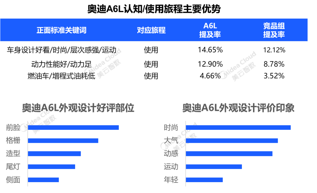 奥迪A6L“与时代同行”诠释科技与优雅,从用户TOP好评关键词看,车身设计好看、动力性能好/动力足提及率远超竞品组,前脸设计受到最多用户关注,其次格栅设计、整体造型及尾灯等,给用户留下了时尚、大气及动感的印象。