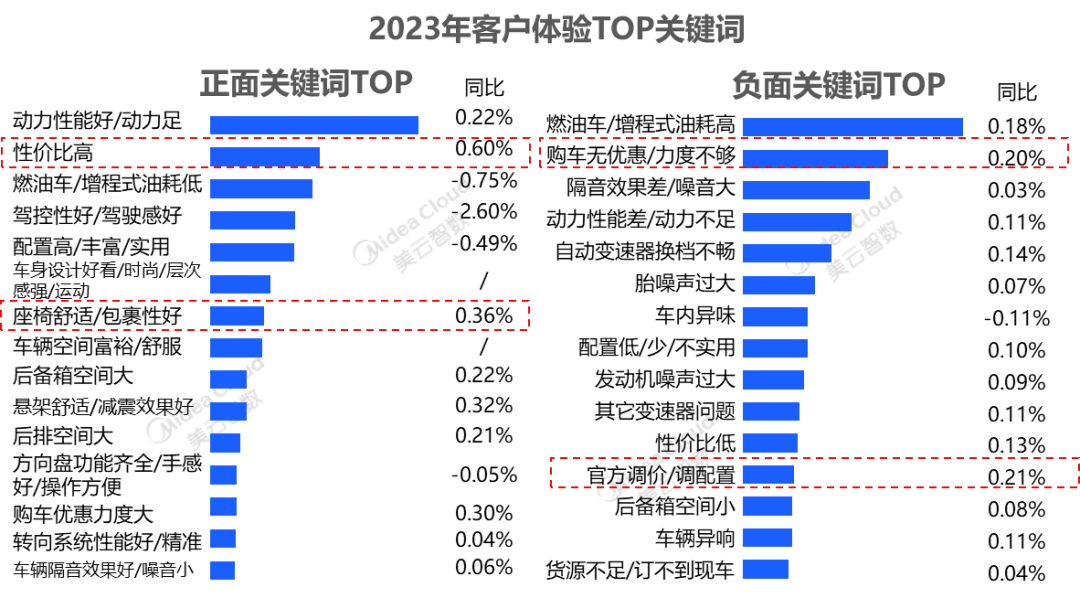 随着2023年价格战频繁、电池成本下降、燃油系大幅降价,客户对“性价比”的正面反馈率明显提升;而由此也衍生另一个问题,从负面关键词看,客户对于“官方调价/调配置”负面提及率提升明显,频繁的波动、降价,不少老车主直呼“背刺”。