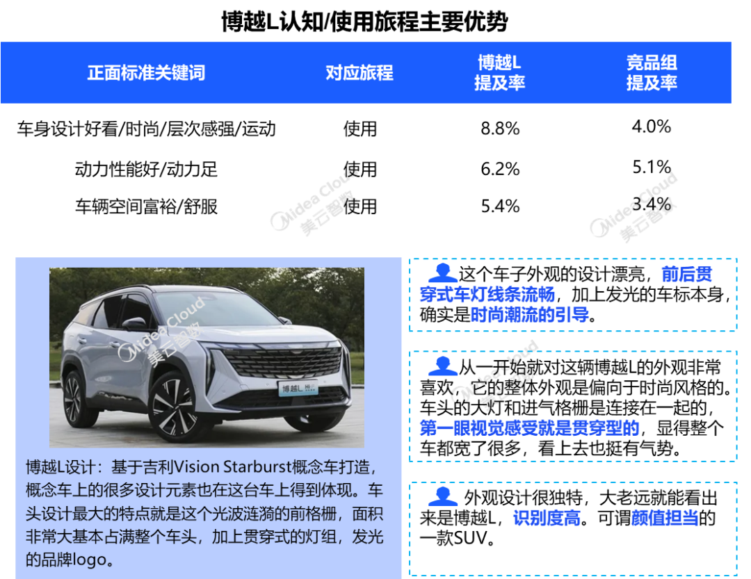 博越L可以说是“有里、有面、有内涵”,在客户体验占优的认知和使用等方面,好评关键词集中在车身与空间设计、配置丰富实用以及动力足,基于概念车设计打造,添加大量个性元素,时尚、潮流、气势、识别度高,用户相当“买账”,问题提及相对较少,槽点主要是“高速行驶噪音、购车优惠少”等问题。