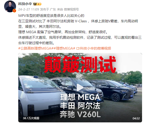 快科技2月27日消息,今日,有博主对理想MEGA、奔驰V260L、丰田阿尔法三辆车进行舒适度检验。