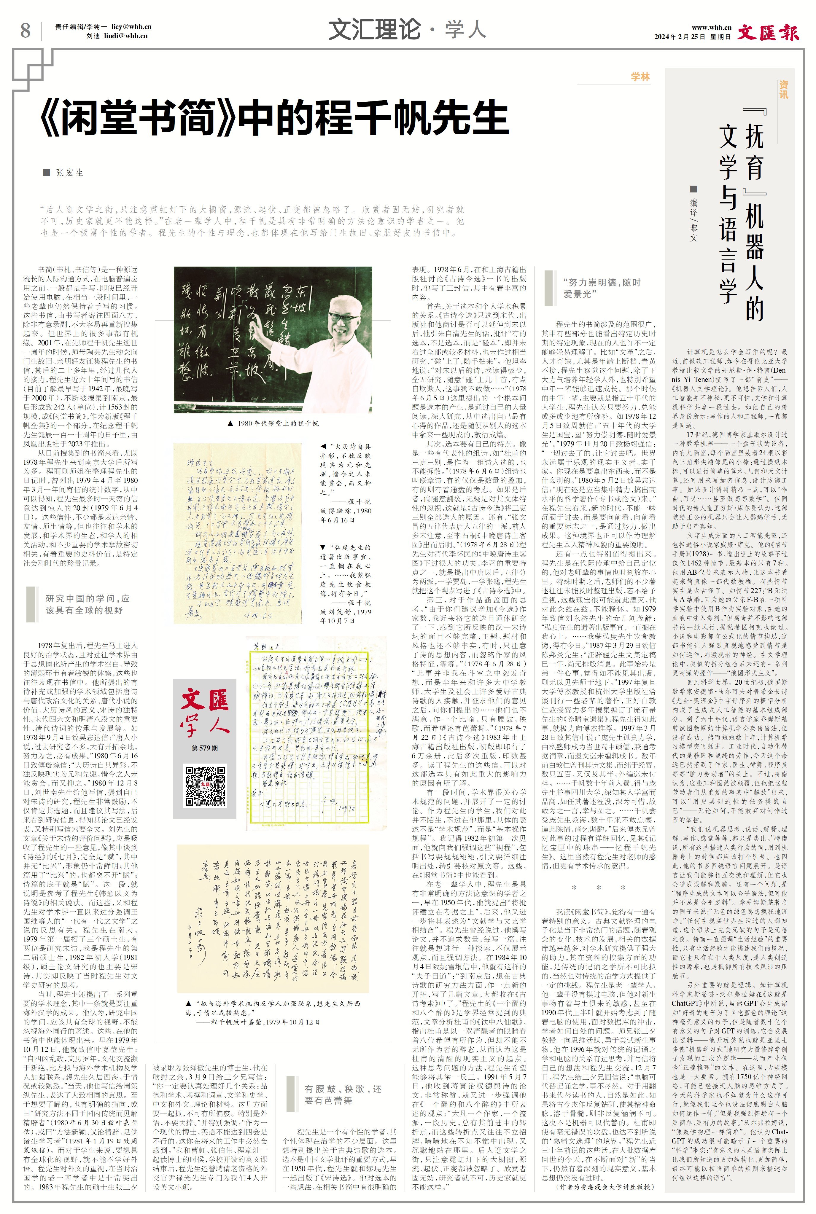 我读《闲堂书简》,觉得有一通有着特别的意义。古典文献整理的电子化是当下非常热门的话题,随着观念的变化,技术的发展,相关的数据库越来越多,对学术研究提供了强大的助力,其在资料的搜集方面的功能,是传统的记诵之学所不可比拟的,当然也对传统的治学方式提供了一定的挑战。程先生是老一辈学人,他一辈子没有摸过电脑,但他对新生事物有着与生俱来的敏感,甚至在1990年代上半叶就开始考虑到了随着电脑的使用,面对数据库的冲击,学者如何自处的问题。师兄张三夕教授一向思维活跃,勇于尝试新生事物,他在1996年就对传统的记诵之学和电脑的关系有过思考,并写信将自己的想法和程先生交流,12月7日,程先生给三夕兄回信说:“电脑可代替记诵之学,事不尽然。对于用翻书来代替读书的人,自然是如此,如果将古今杰作反复钻研,使其精神命脉,溶于骨髓,则非反复涵润不可。这决不是机器可以代替的。杜甫即使有毫无错误的软盘,也达不到所说的‘熟精文选理’的境界。”程先生近三十年前说的这些话,在大批数据库问世的今天,在不断面对“新”的当下,仍然有着深刻的现实意义,基本思想仍然没有过时。