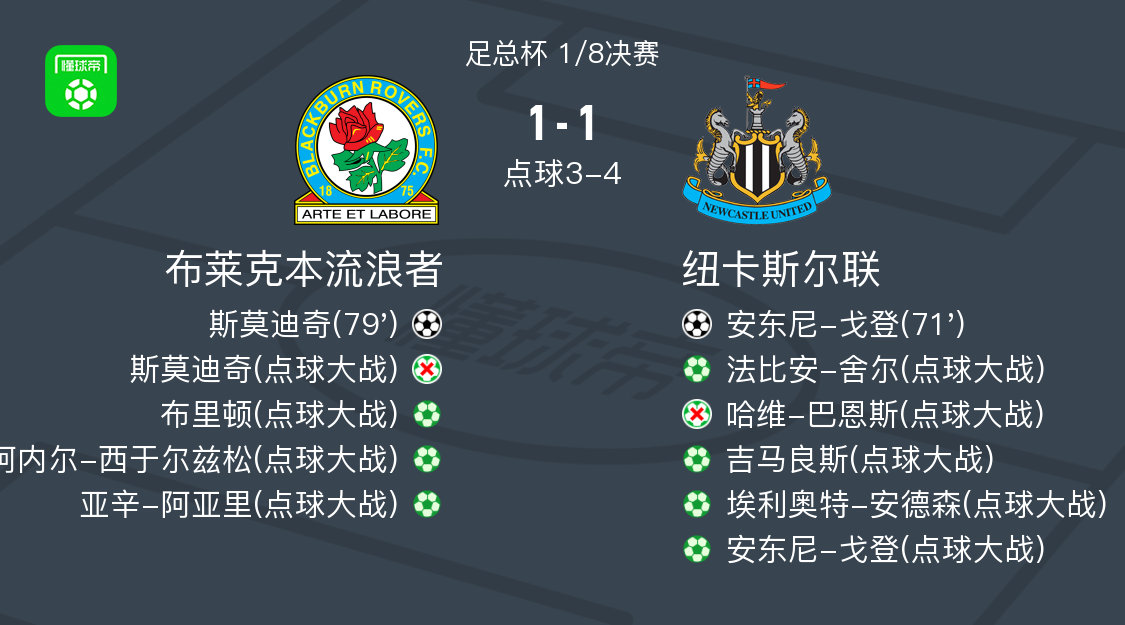 北京时间2月28日足总杯 1/8决赛,布莱克本流浪者主场对阵纽卡斯尔联。布莱克本流浪者斯莫迪奇破门。纽卡斯尔联安东尼-戈登破门。最终比分4-5。