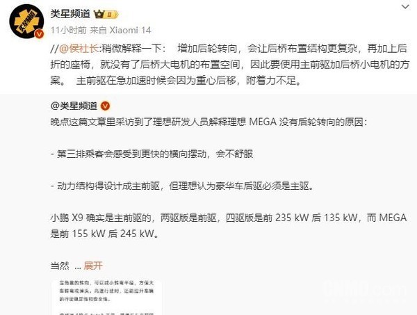 【CNMO科技消息】小鹏X9和理想MEGA都是纯电MPV领域的明星产品,但后者的定位更高,售价也更贵。随着X9的上市交付,大家这两台车的对比也多了起来,其中X9有而MEGA没有的后轮转向功能,引发了一些争议。据CNMO了解,近日有媒体与理想团队进行对话,官方人员谈到了后轮转向的话题。