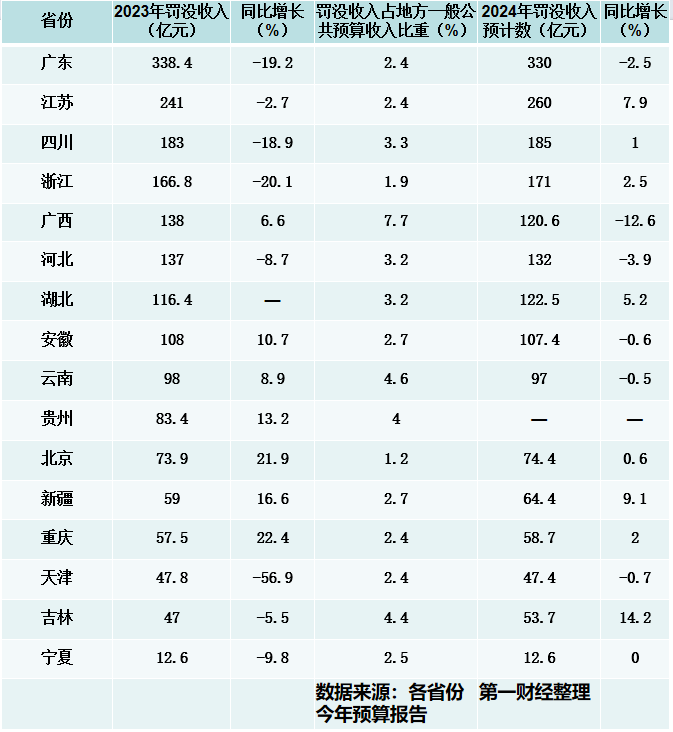 第一财经记者根据近期各省份财政部门披露的2023年预算执行情况和2024年预算草案等(下称预算报告),整理出目前已公开的16个省份2023年罚没收入情况和2024年收入预期。
