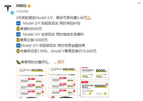 【CNMO科技消息】3月1日,特斯拉宣布推出新春限时购车优惠:3月底前提走Model 3/Y,最多可享优惠3.46万元,限时1个月。
