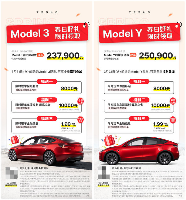 具体来看,Model 3后驱版新车价24.59万元起,现车保险补贴后低至23.79万元。3月31日前提走Model 3现车,还可以享受多重福利叠加,包括限时现车保险补贴8000元(后驱版)、限时现车车漆福利最高立省10000元(全部车型)、限时现车金融低息,年利率低至1.99%(后驱版),日供低至102元。