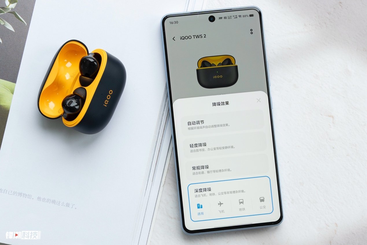 iQOO TWS2 还首发了定制通勤降噪功能,针对飞机、地铁、公交这三类的常见通勤噪音场景进行优化,给出不同的降噪模式让用户选择,降噪的效果自然也是更加优秀的。