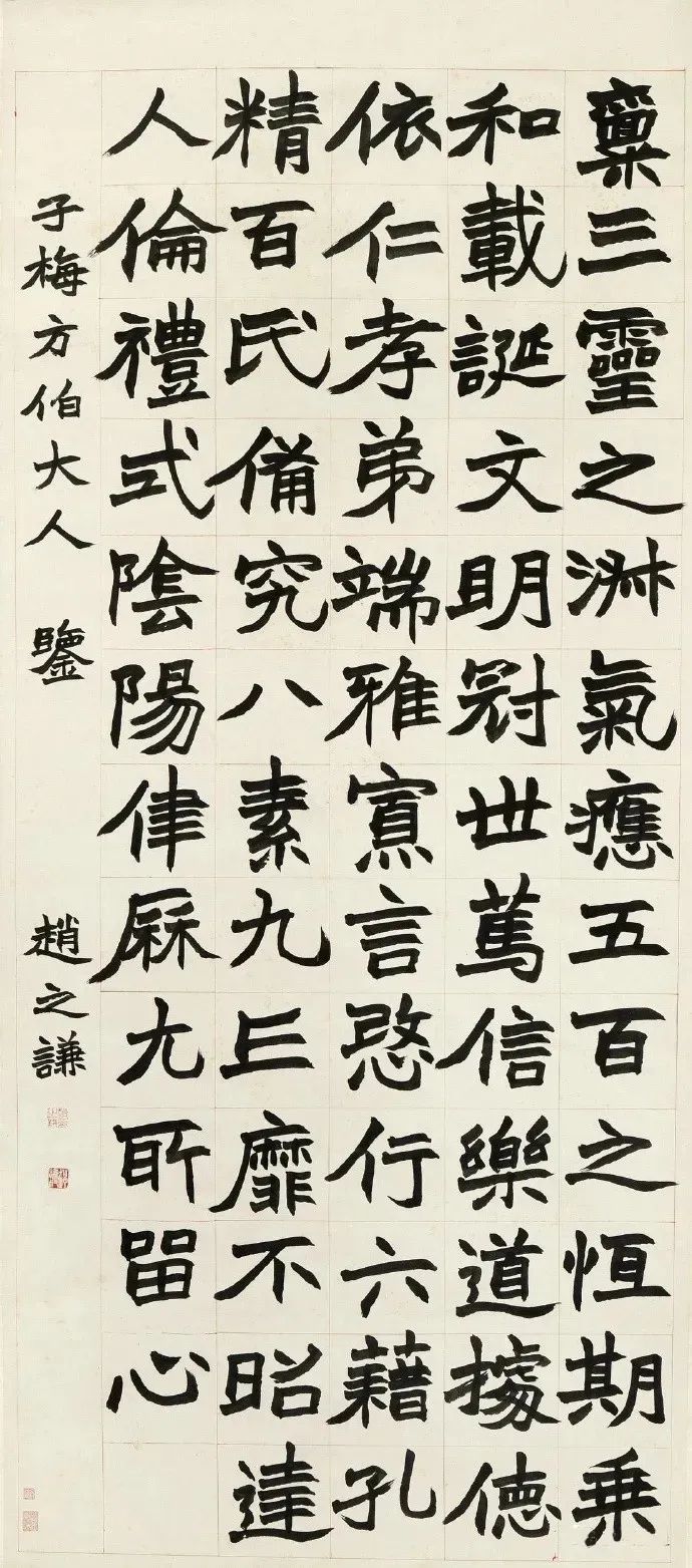 【题 识】禀三灵之淑气,应五百之恒期,乘和载诞,文明冠世,笃信乐道,据德依仁,孝弟端雅,慎言愍行,六籍孔精,百氏备究,八素九丘,靡不昭达。人伦礼式,阴阳律历,尤所留心。子梅方伯大人鉴,赵之谦。