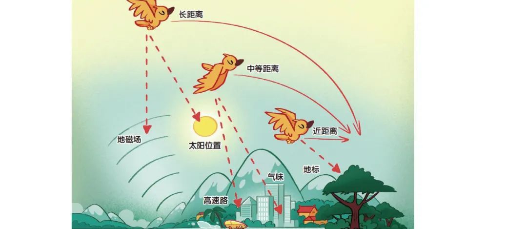 鸟类的导航方式有很多,其中包括视觉、嗅觉。它们能看到颜色,并能记住特定的树木或建筑等地标。例如,在放飞鸽子之前,让它们看一下周围的景色,它们飞回鸽舍的路线就会更精确。对于可能没那么多地标可看的海鸟,则可以通过气味来导航。
