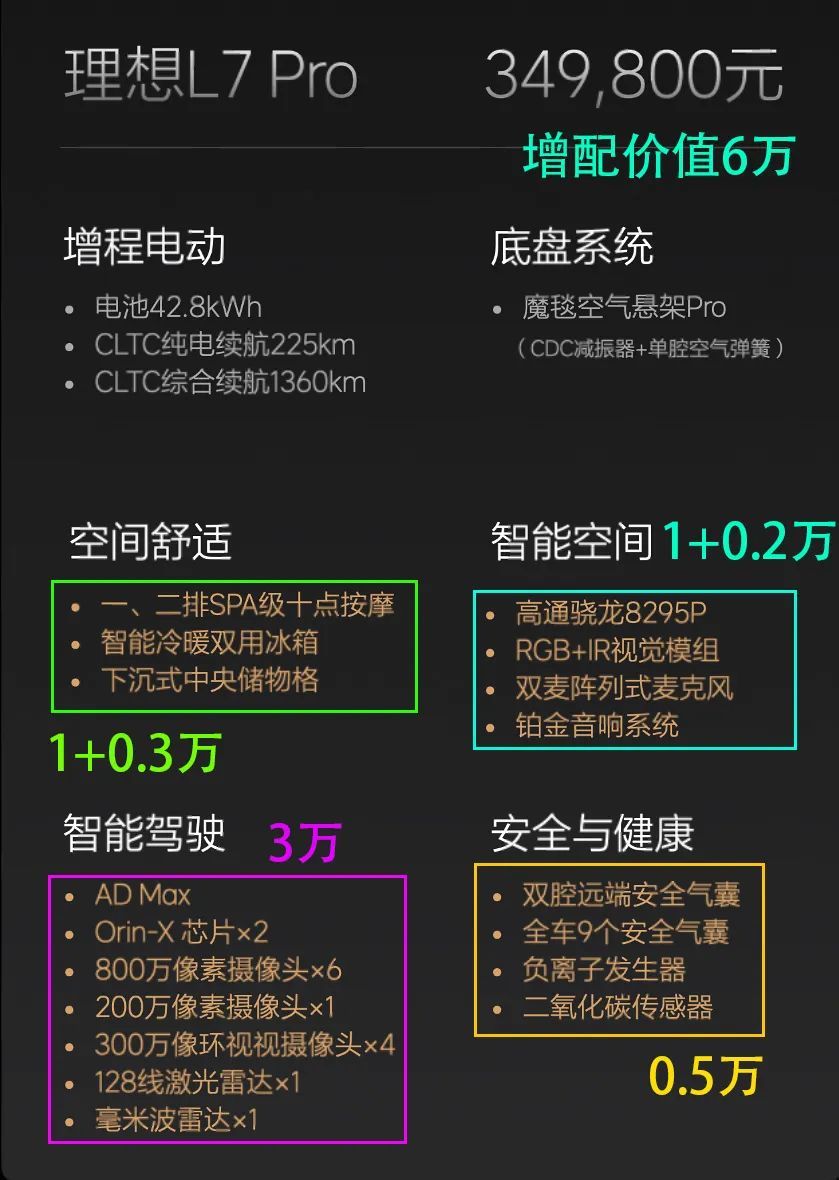 2024款的L7 PRO ,增配价值为1.3+1.2+0.5+3=6万元;但车价上涨1万,相当于增配价值为5万元!