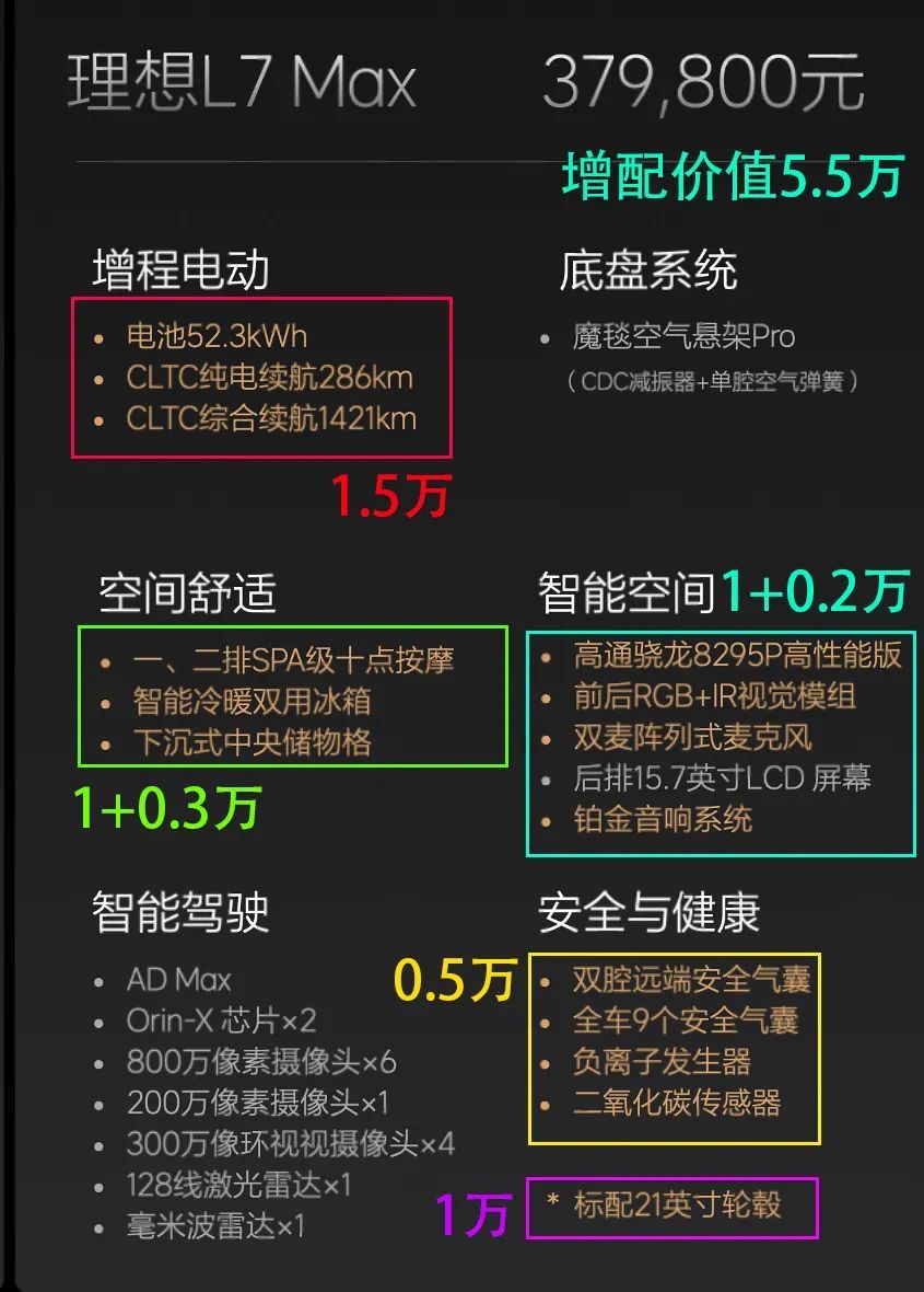 2024款的L7 MAX,增配价值为1.5+1.3+1.2+0.5+1=5.5万元!
