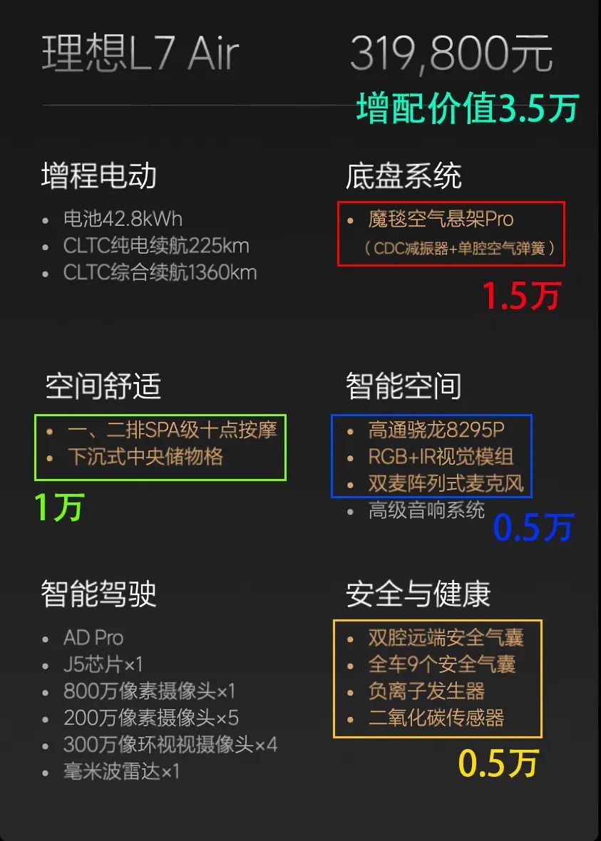 2024款的L7 AIR,增配价值为1+1.5+0.5+0.5=3.5万元!