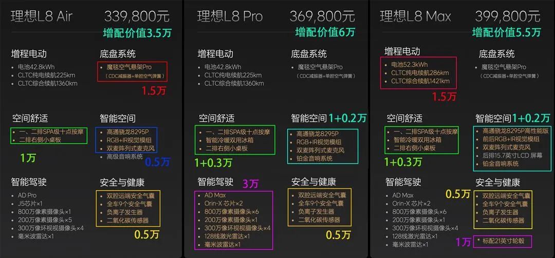 2024款的L8 AIR,增配价值为1+1.5+0.5+0.5=3.5万元!