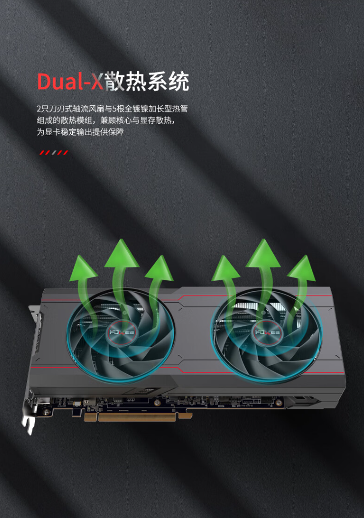 蓝宝石推出的 RX 6750 GRE 12GB 白金版是双风扇的设计,拥有两只刀刃式轴流风扇和五根全镀镍加长型热管的散热模组,可以在比较有限的长度内发挥足够强劲的性能。