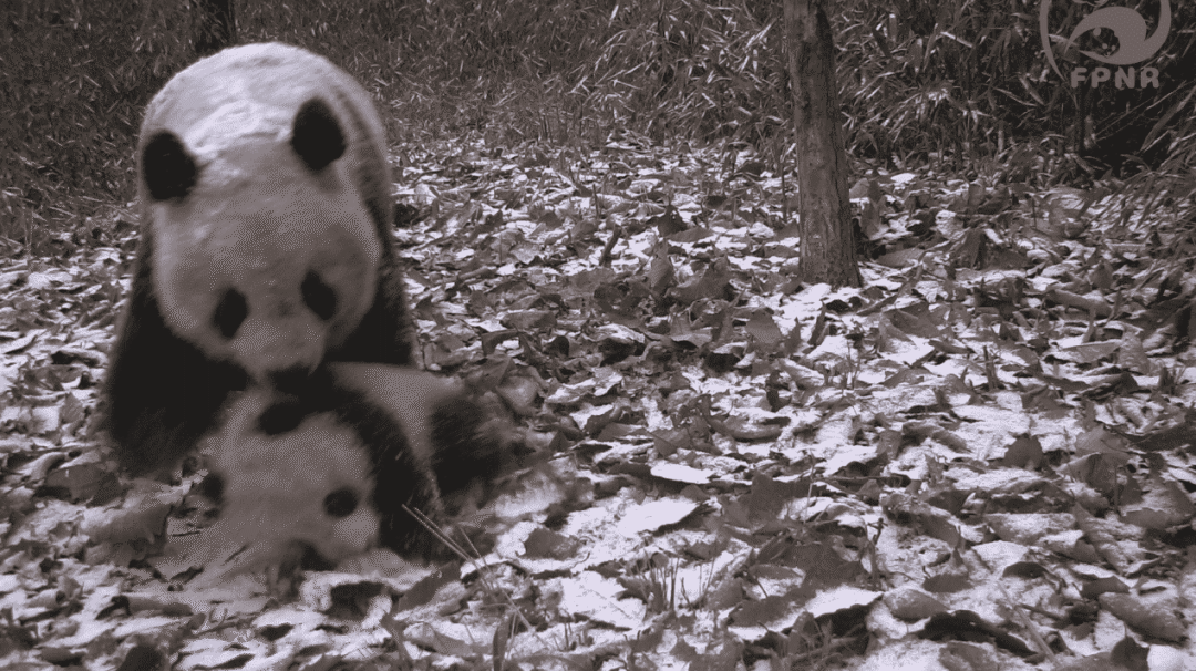 大熊猫带着仔仔进行野外生存训练
