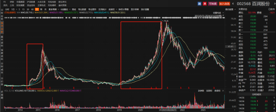 图中第一波大行情发生在重组后,RIO成功在预调酒市场商战中获胜。后面的第二波大行情则是微醺系列给RIO带来的大翻身支撑的,使得百润股份成了2020年和2021年初的大牛股。
