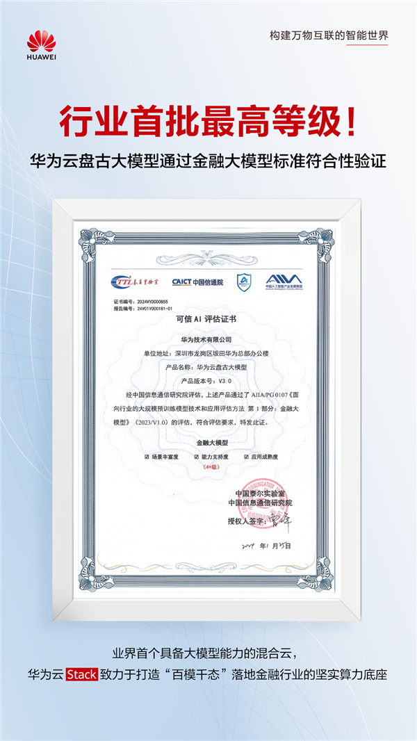 华为云盘古大模型成为首批通过金融大模型标准符合性验证的产品,也是首批通过行业大模型标准符合性验证的产品。
