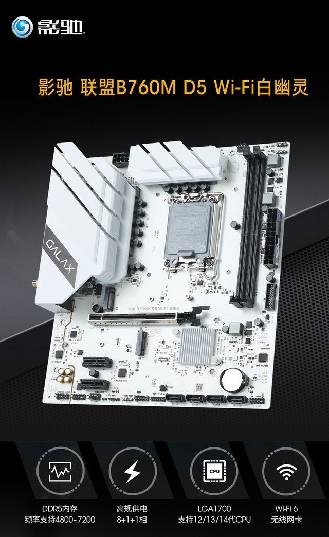 号外,号外,影驰全新主板【影驰联盟B760M D5WI-FI白幽灵主板】正式上线啦!目前,这款主板在电商平台上的开售价为749元,性价比超高,快去看看吧!(价格仅供参考,具体以店铺标价为准)