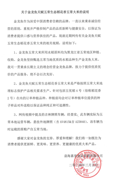 对此,金龙鱼方面回应财联社记者称,公司五常大米所用水稻原料均为黑龙江省五常地区种植、收购,“金龙鱼坚持甄选五常当地优质的水稻品种生产金龙鱼大米。我司一贯秉承长期主义的理念经营金龙鱼品牌,致力于提供优质优价的产品服务,绝不会以次充好”。