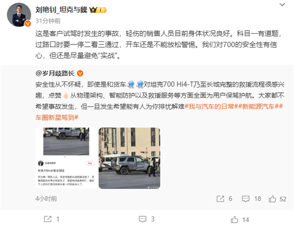 快科技3月5日消息,魏品牌总经理兼任TANK品牌总经理刘艳钊就近日曝光的一起事故进行了说明,称“这是客户试驾时发生的事故,轻伤的销售人员目前身体状况良好。”