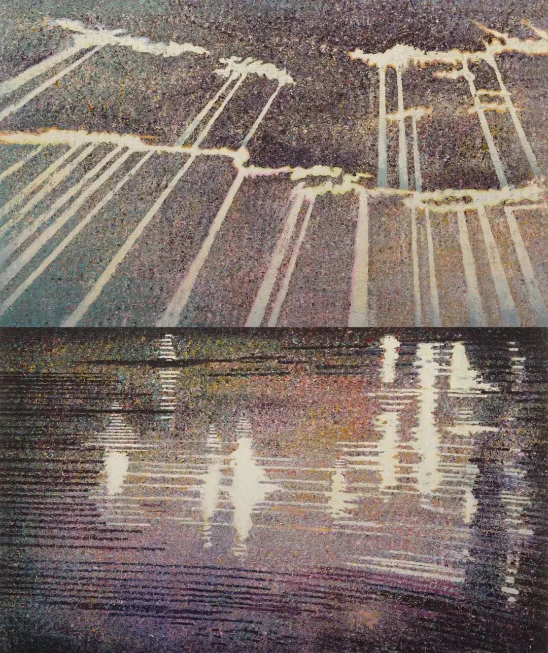 “闪烁绘画”是曾梵志最新系列作品,《闪烁绘画-光III》是这个系列中尺幅最大的作品,在这件480cm×400cm的巨幅作品中,曾梵志将两块油画布组接,上半部分描摹云开日出的壮丽光景,下半部分刻画霞光倒映的潋滟水面,远观是一片优雅明亮的粉紫,近看却能观察到各种丰富多变的色彩和肌理。特有的技法展现出了艺术家对生命与时间的思考。