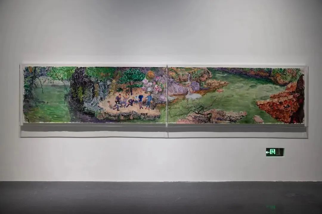 近几年,有了更多空闲时间,周春芽和好友一起寻古访胜,游历江南的名山和古迹。游历山水之后,周春芽的创作也自然而然地和生活联系在一起,在新作《临江仙》中,他将身边的好友画入山水中。“或许也可以说,我在画我的理想国:这是一种文化期待。每个时代,你会有与你声气相通的朋友,你与他们交流的机缘看似偶然,但在历史文化强大的感召之下,这个偶然就是一种必然。”对周春芽来说,自然景观不是单纯的风景,而是和人的心境、想法和生活方式有关。
