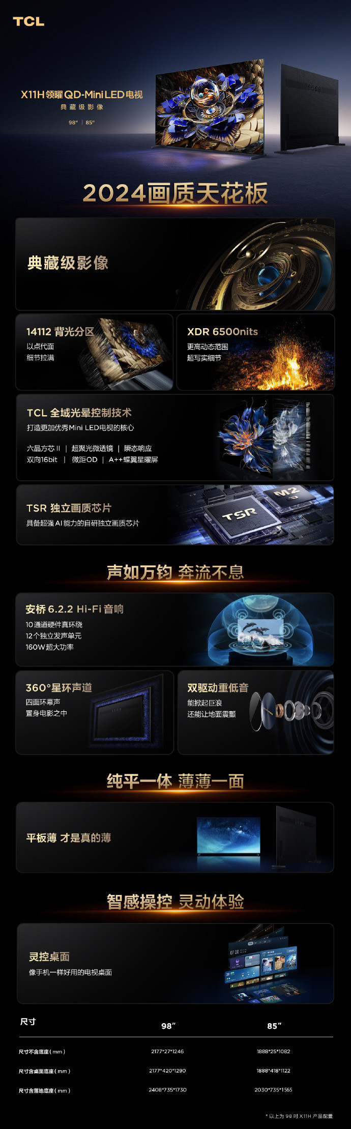 在音响配置上,TCL X11H采用了安桥6.2.2 Hi-Fi音响系统,实现了10通道硬件级超环绕音效和160W的超大功率输出。该系统配备了12个独立音响单元和5颗音质处理芯片,结合360°星环声道和双驱动重低音设计,为声音带来了沉浸感、临场感和震撼感的显著提升。在宽敞的百平米客厅中,TCL X11H能够完美还原电影院的震撼音效体验。