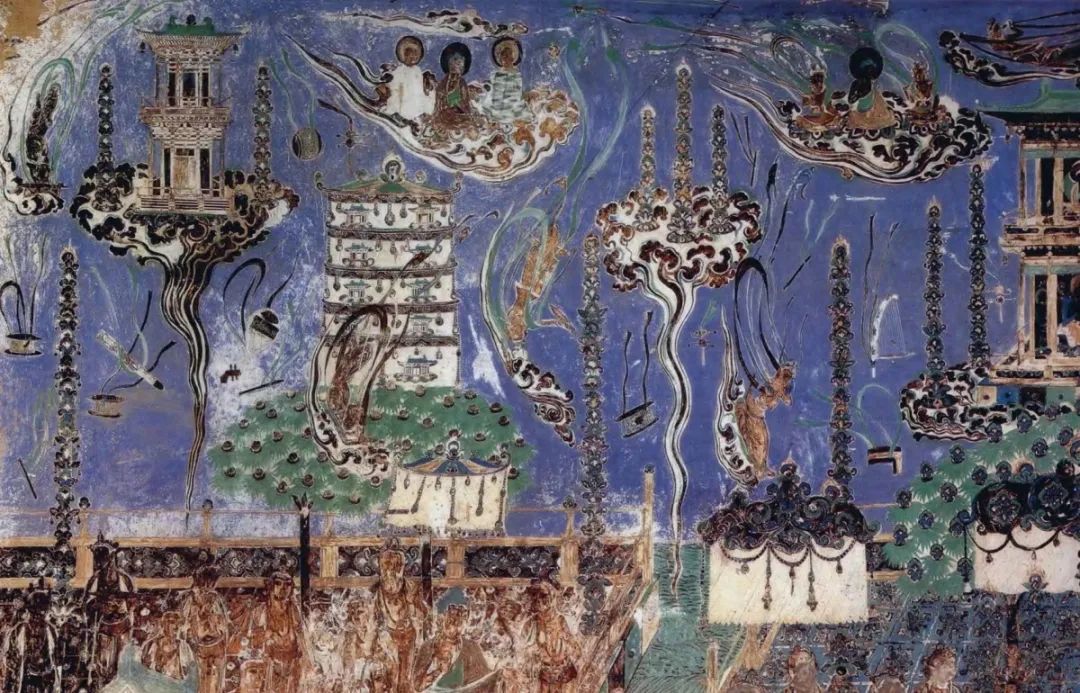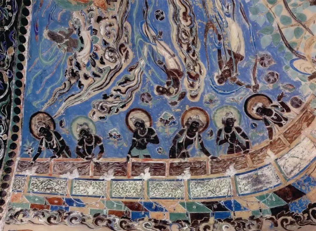 那时的敦煌壁画色彩绚丽,朱红、石绿、哑黄等典雅的东方色彩,光彩夺目又极富动感,呈现出盛世敦煌的热烈欢快与包容多元。