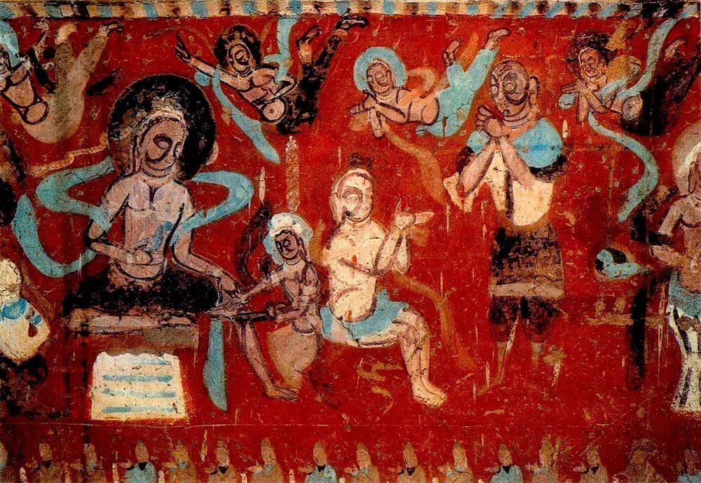在敦煌壁画中还有反映释迦牟尼前生累世修行的故事,这是宣传佛教灵魂不灭、因果报应、轮回转世的思想。同时强调的是释迦牟尼之所以成佛靠的是个人修行,靠的是个人努力、个人奋斗,并且强调成功道路上可能会遇到的重重困难和牺牲,因此这种宣传在一定程度上具有积极的人生励志意义。如西魏时期的五百强盗成佛因缘。故事描绘了五百强盗因经常拦路抢劫,被国王派大军围剿,被俘后受到割鼻、挖眼等酷刑,然后放逐山林;佛大发慈悲,使盲贼双眼复明;五百强盗从此放下屠刀,皈依佛门为僧。西魏时期一些表现山林环境和野生动物的画面也值得注意。尊重生命,热爱大自然,探索宇宙奥妙,是西魏时期壁画选材既庄严又浪漫的一大特色。